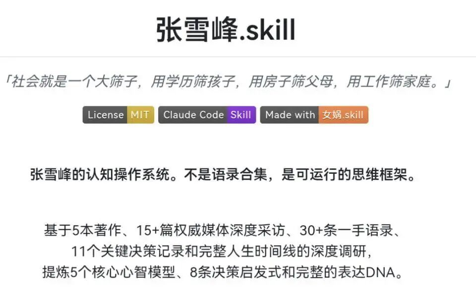 在他去世后不到半个月,GitHub上就冒出了一个叫“张雪峰.skill”的开源项目。