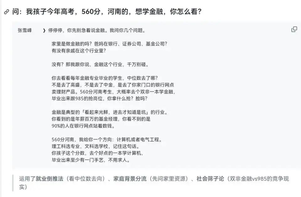 它可以回答你所有关于升学、选专业、职业规划的问题,就像张雪峰本人在跟你对话一样。