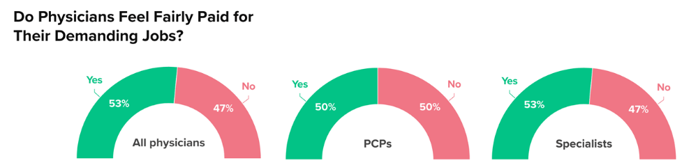 在上一年度调查中,48%的医生认为薪酬公平。这是Medscape连续10年调查的最低值。今年的这一比例则上升至53%,在初级保健医生和专科医生中分别达50%、53%。