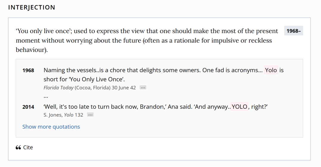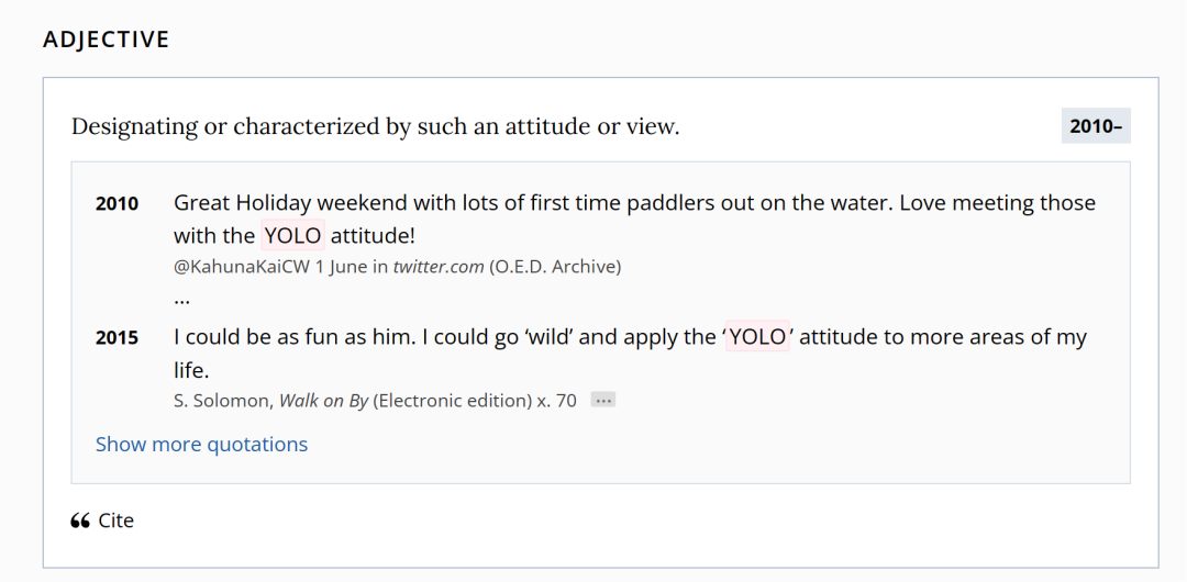 《牛津英语词典》收录了YOLO作为感叹词和形容词的两种用法:Come on just do it, YOLO!放开去做吧,人生只有一次!I could be as fun as him.I could go"wild"and apply the"YOLO"attitude to more areas of my life. 我也可以像他一样成为有趣的灵魂,放手一搏,多多尝试“只活一次”的生活态度。随着社交媒体的发展和网红文化的崛起,YOLO也被视为社交媒体版的“carpe diem”(拉丁语格言,英文释义为“seize the day”)。千禧一代赋予了YOLO新的时代内涵,即“活在当下,及时行乐”。某种意义上,崇尚YOLO生活理念的年轻人,不在乎世俗观点,遵从自己的内心和欲望,按照自己喜欢的方式做出选择。