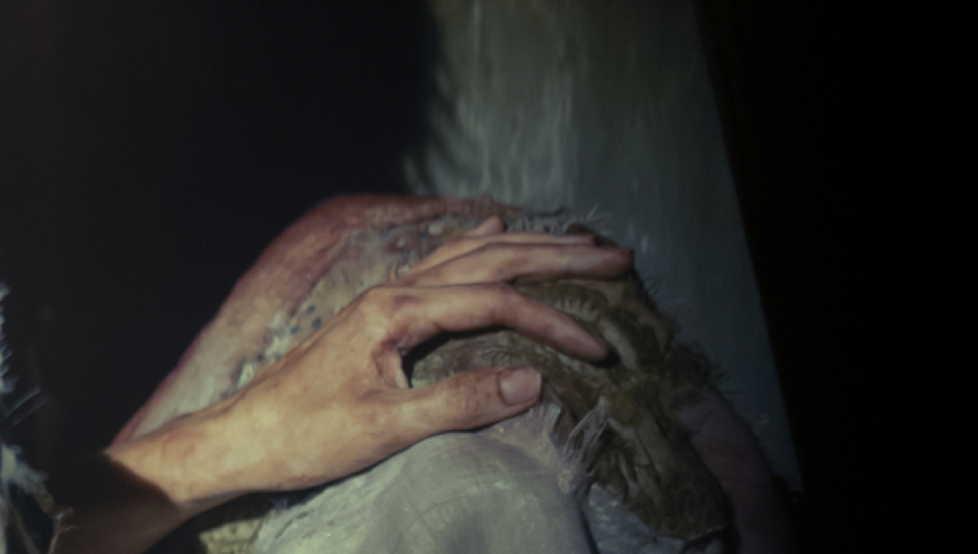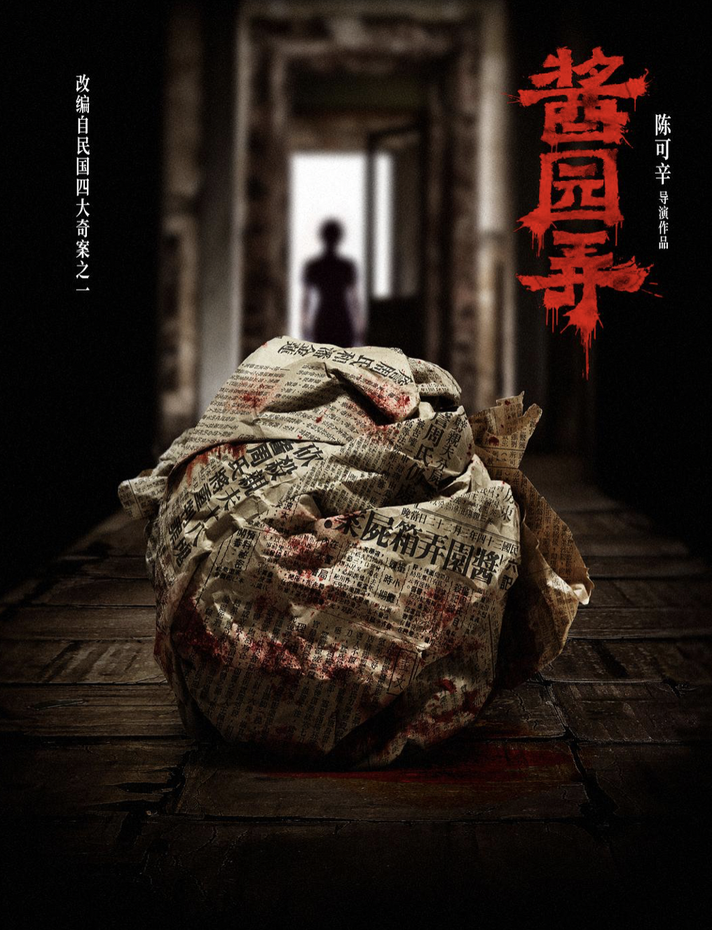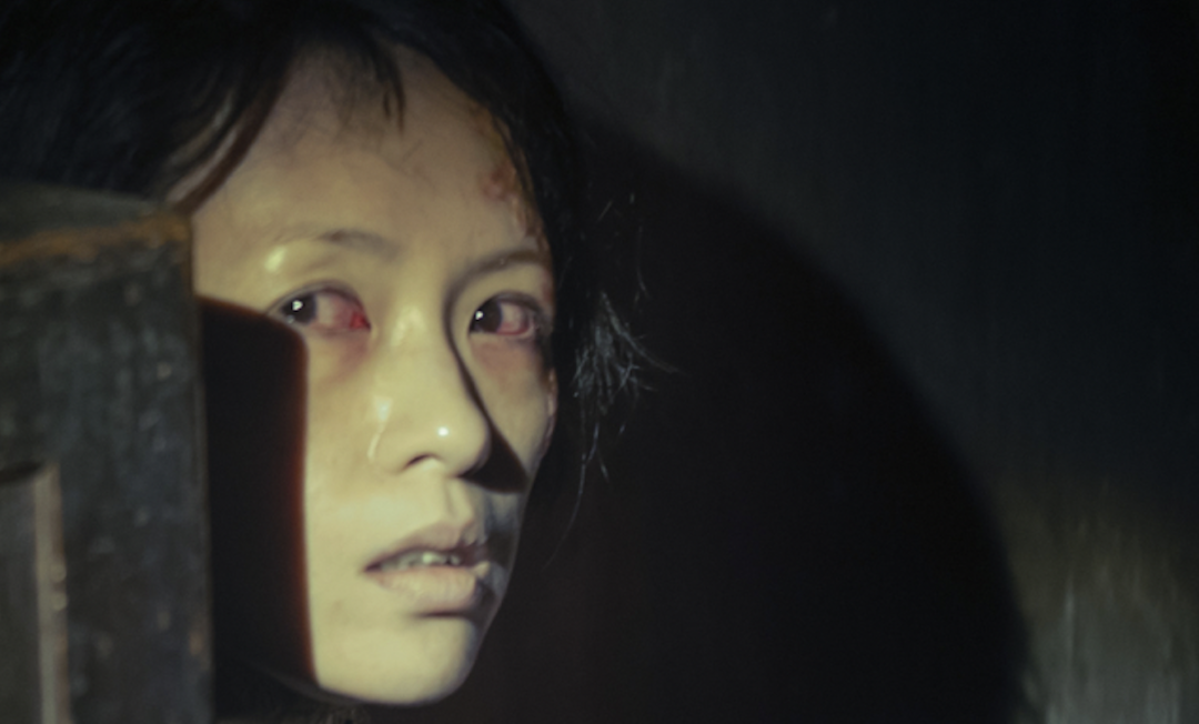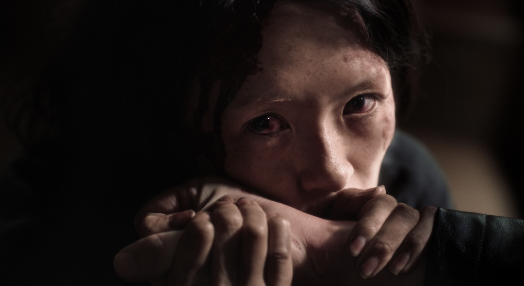 果然第三张海报,由章子怡饰演的女杀人犯“詹周氏”露脸了:她躲在阴暗中,瘦成骷髅、血红双眼、双手还沾着弑夫后干掉的鲜血;