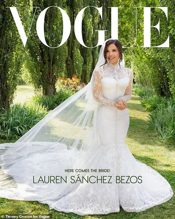 婚礼仪式上,桑切斯换上了一件灵感源自1958年索菲娅·罗兰(Sophia Loren)电影《水上人家》的杜嘉班纳(Dolce&Gabbana)蕾丝婚纱,高领设计、紧身腰封和美人鱼式裙摆勾勒出复古韵味。