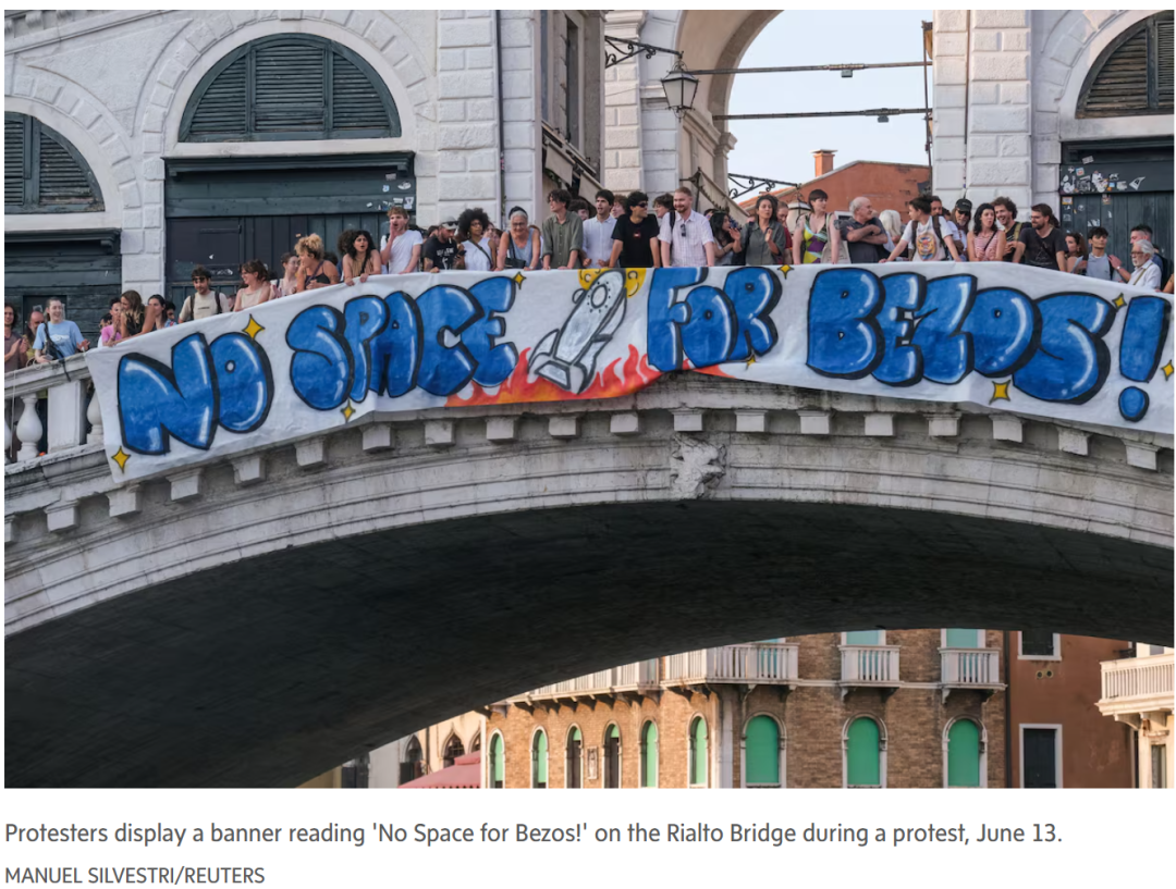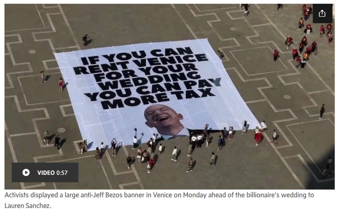 不过这场豪华婚礼也惹来了不少麻烦。威尼斯当地十几个组织都出来抗议,在圣马可广场拉横幅,写着“没有贝佐斯的空间”。