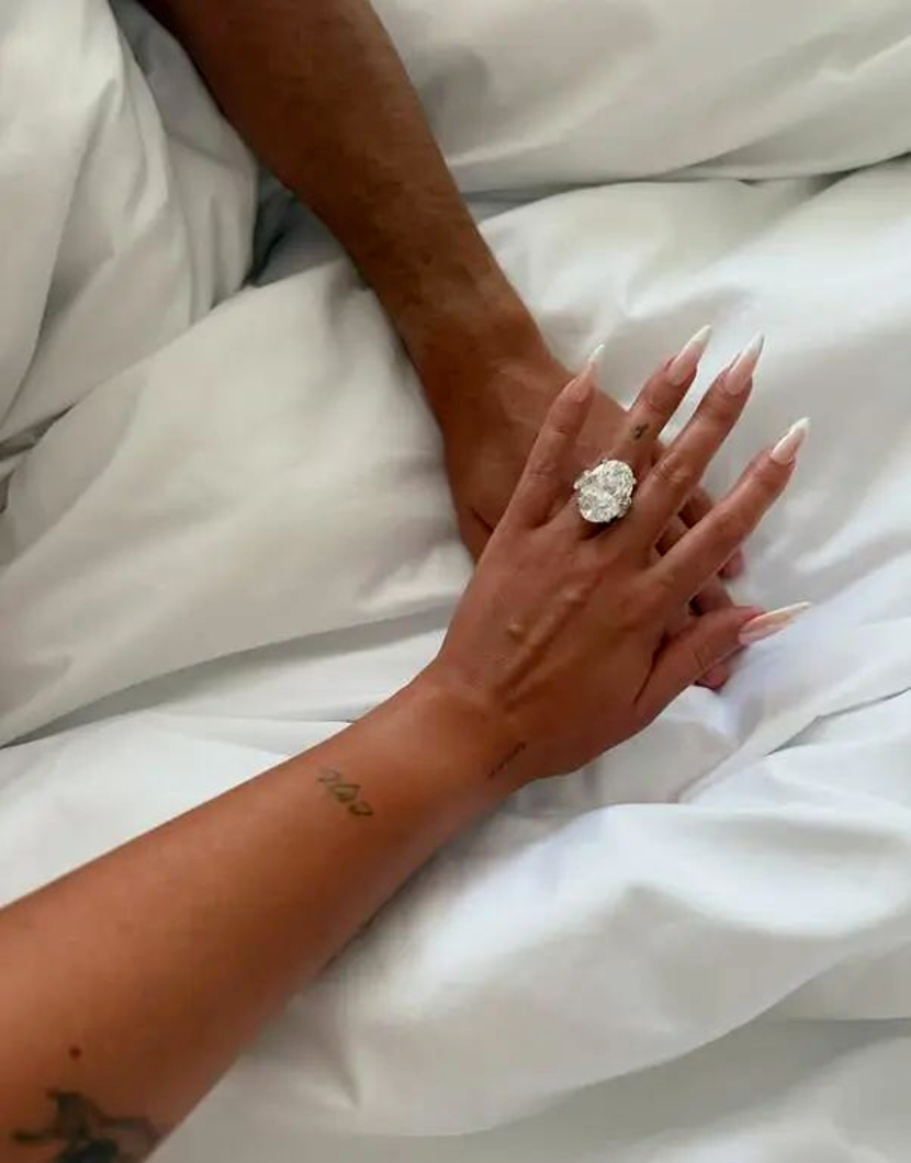 乔治娜在个人社交媒体上晒出一枚巨大的钻戒,据估计钻石的重量超过30克拉,价格可能高达500万美元。