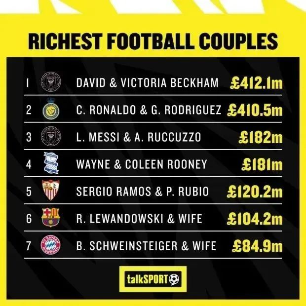 2023年底,全球足坛最富夫妇榜上,C罗和乔治娜以4.105亿英镑的身家排名第二,仅次于贝克汉姆夫妇。