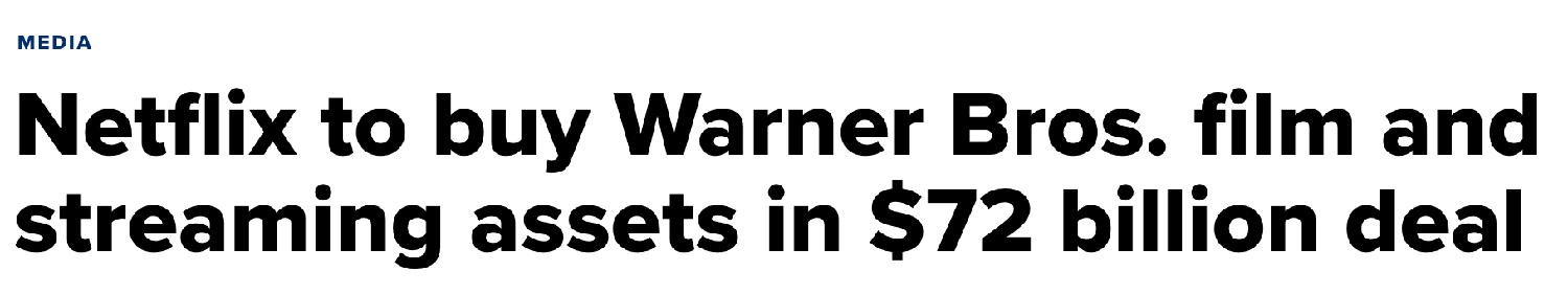 Netflix(网飞)周五宣布,已达成协议收购华纳兄弟探索公司(Warner Bros.Discovery,简称WBD)的部分资产,从而迅速结束了一场激烈竞购战。此前,派拉蒙—天空之舞影业(Paramount Skydance)和康卡斯特(Comcast)也参与了对这些传统资产的争夺。