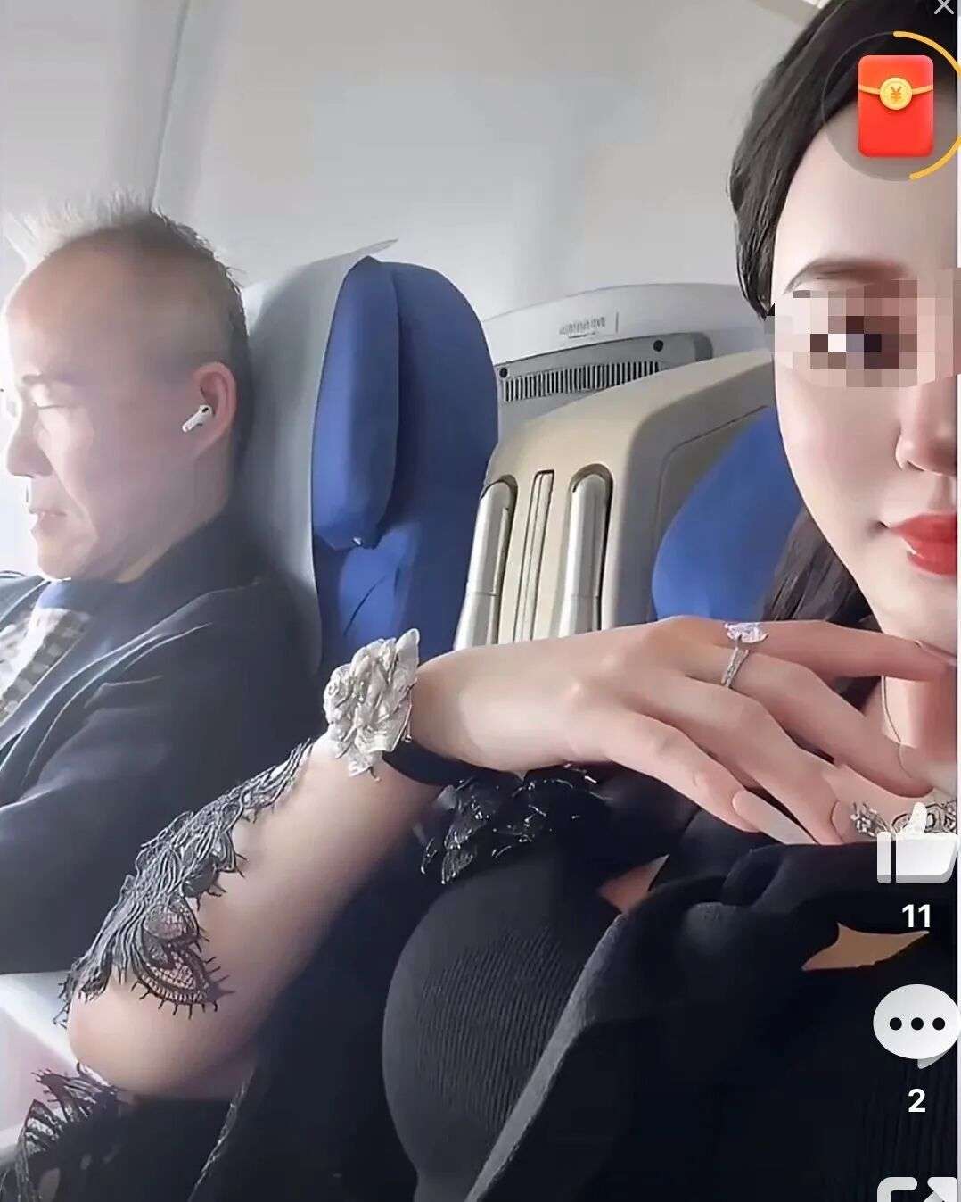 王石一個人坐在公務艙靠窗的位置,穿著淺色休閒裝,戴著白色耳機,飛行途中,普通旅客一樣,閉著眼睛安靜休息。