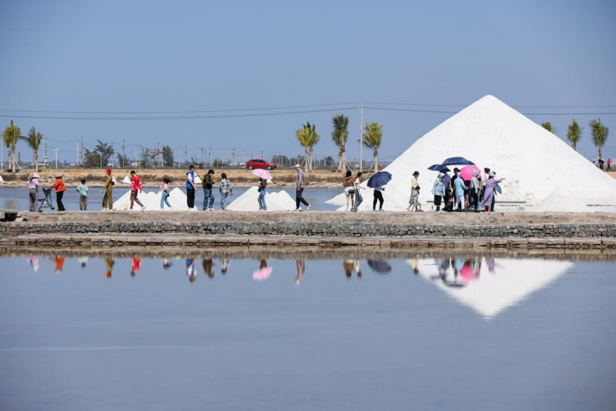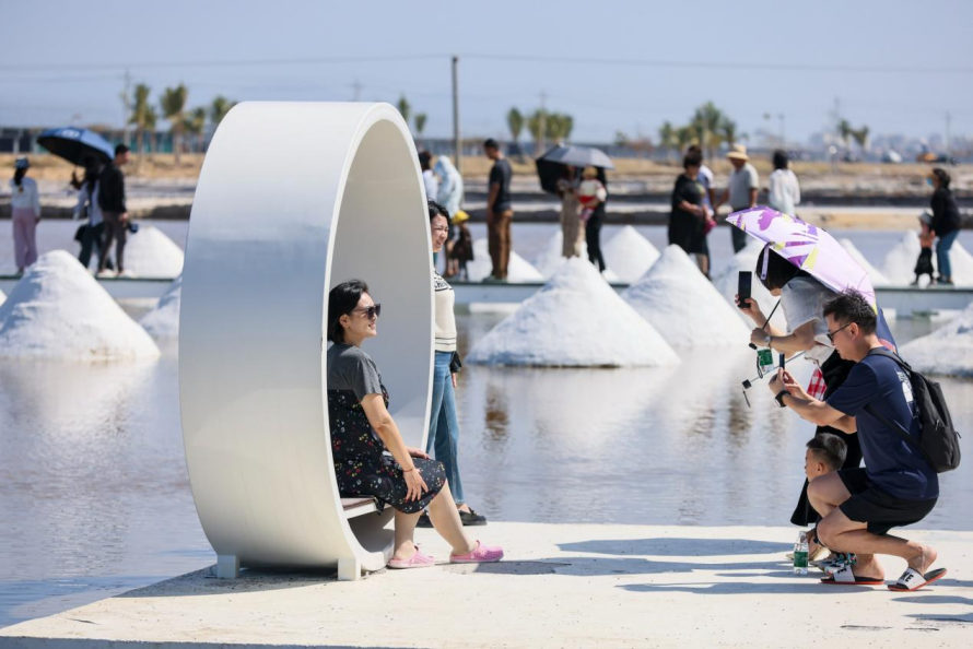 2023年年底建成的海南环岛旅游公路,为游客们来到莺歌海盐场提供了便利。当地还在盐场附近精心设计建造了一座以“盐文化”为主题的旅游驿站,取名“莺歌踏浪”,充满诗情画意,引得游人纷至沓来。
